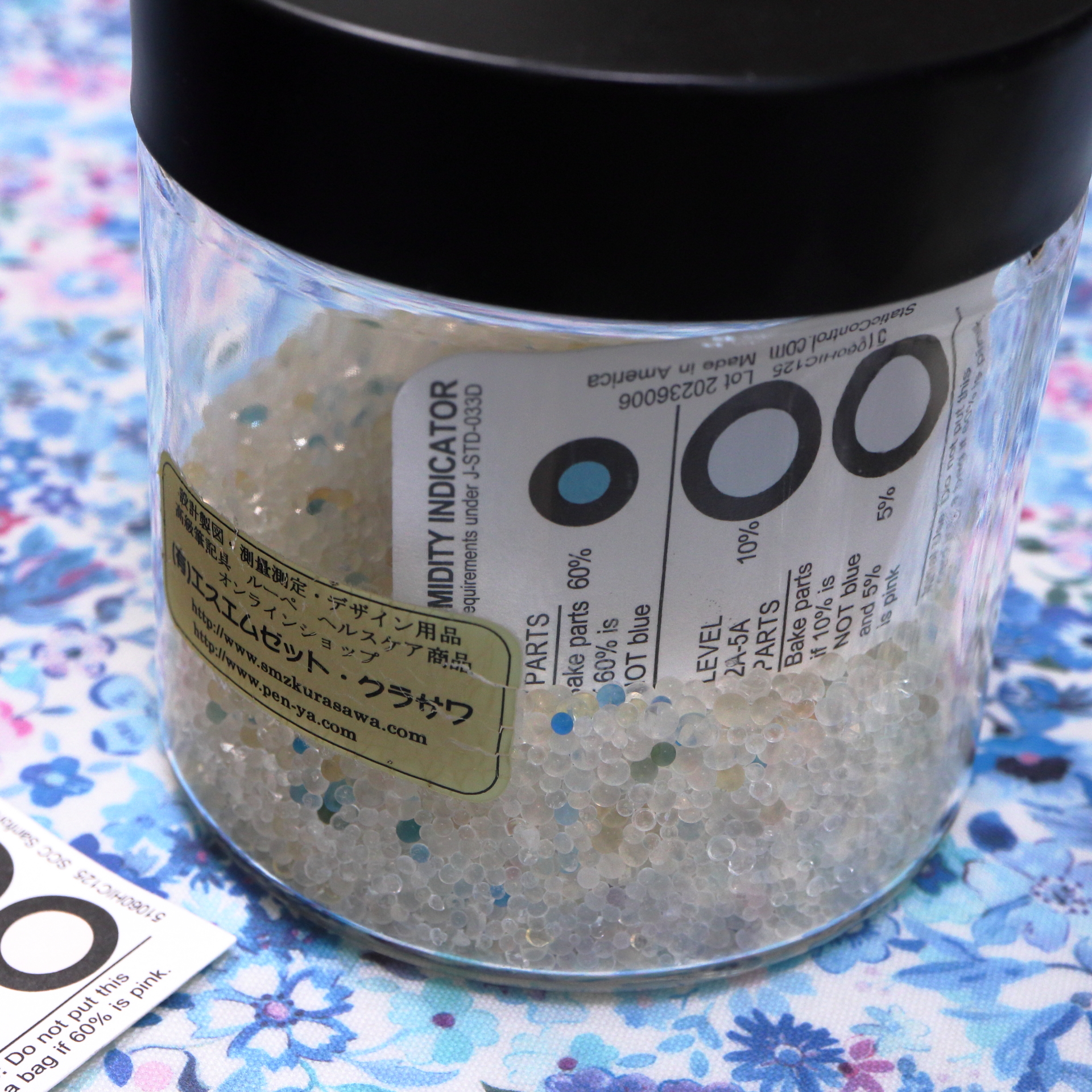 シリカゲルはあくまで多孔質表面への物理吸着であり、容器全体の総水分量を低減する効果は限定的です。
